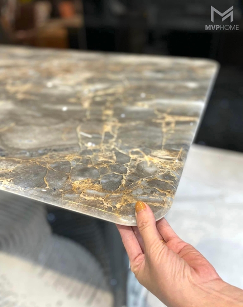 Việc thiết kế kiểu dáng không chỉ làm tăng thêm cho sản phẩm ấn tượng mà bên cạnh đó chất liệu để sản xuất sản phẩm còn gây cho chúng ta thêm phần chú ý hơn. Đá cẩm thạch là chất liệu chính với sản phẩm này và được dùng sử dụng trên bề mặt bàn ăn. Cùng với đó là một vật liệu bền, chịu nhiệt và dễ lau chùi giúp chúng ta hoàn toàn thoải mái ăn uống và dễ dàng vệ sinh.