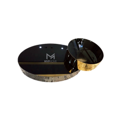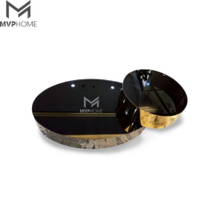 Khung bàn trà đôi xoay benson được từ inox mạ titan và inox mạ vàng PVD. Trên bề mặt của mỗi bàn trà đều được trang bị bằng một mặt kính đen tạo nên điểm đồng nhất. Bên cạnh đó, cùng với phần khung mạ vàng và xám sẽ được tôn lên giụp tạo ra điểm nhấn cho không gian riêng của mình.