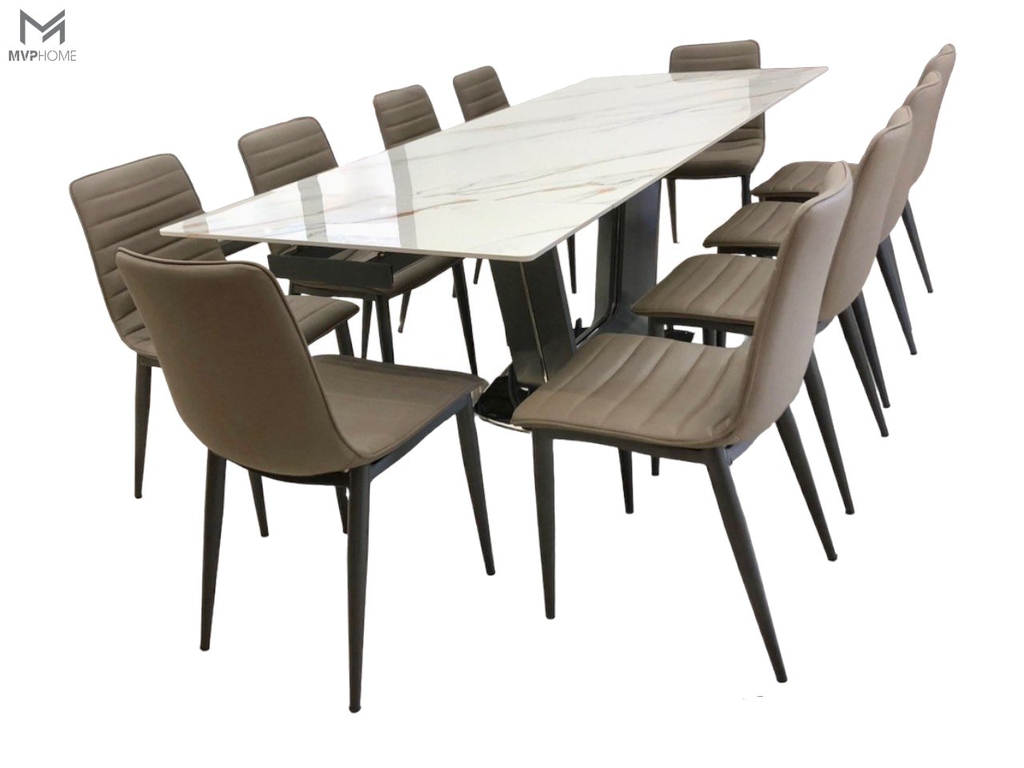 Với phần chân của bàn được thiết kế có kiểu dáng hình chữ V được làm từ inox mạ titan (chống han rỉ) giúp bạn sở hữu và sử dụng lâu hơn, bền hơn. Mặt bàn cũng được làm từ đá ceramic sáng bóng kết hợp những đường vân đá tự nhiên tạo nên vẻ đẹp và điểm nhấn ngay trên bạn. Không những vậy, với mặt đá ceramic bạn còn có thể dễ dàng vệ sinh, không lo trầy xước và có khả năng chống thấm nước rất tốt.