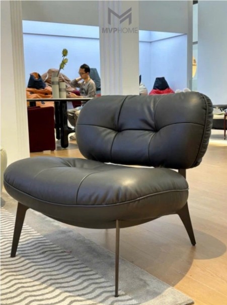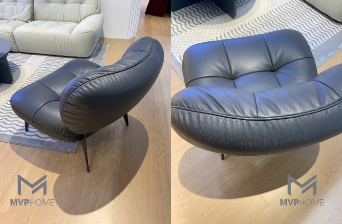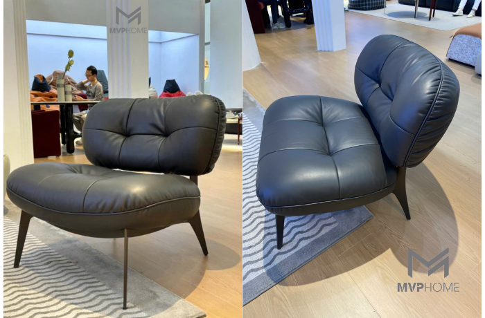 Màu sắc của da (trong hình là một màu xanh navy hoặc xám xanh đậm) mang đến cảm giác sang trọng, sâu lắng và rất dễ phối hợp với các món nội thất phòng khách khác. Chiếc ghế này không chỉ là nơi để bạn nghỉ ngơi, mà còn là một tác phẩm nghệ thuật, góp phần nâng tầm đẳng cấp cho toàn bộ không gian.