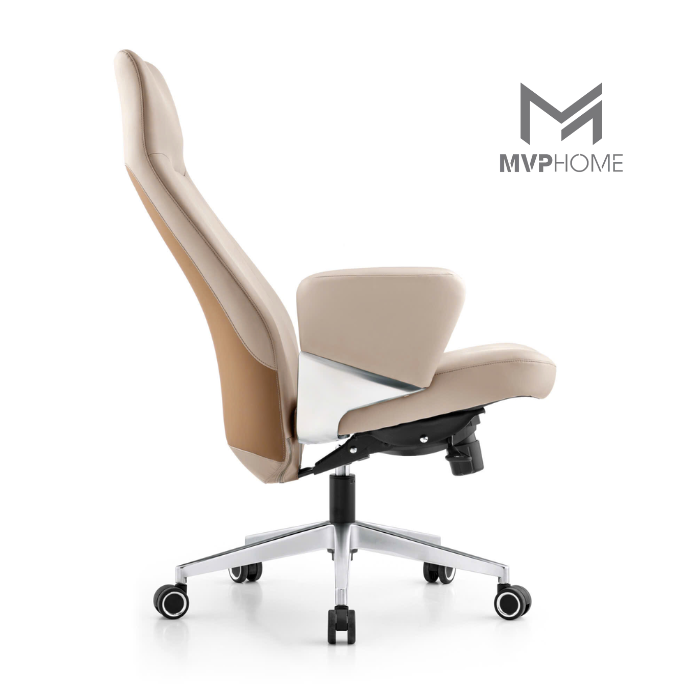Bên cạnh chất liệu da, phần khung ghế cũng được chú trọng lựa chọn từ hợp kim cao cấp, có khả năng chịu lực tốt, chịu tải trọng lớn. Thiết kế chân xoay với năm bánh xe chắc chắn, di chuyển êm ái, không gây tiếng ồn. Điều này đặc biệt hữu ích trong các văn phòng hiện đại, nơi việc di chuyển nhẹ nhàng và êm ái là ưu tiên hàng đầu để duy trì môi trường làm việc yên tĩnh, chuyên nghiệp.