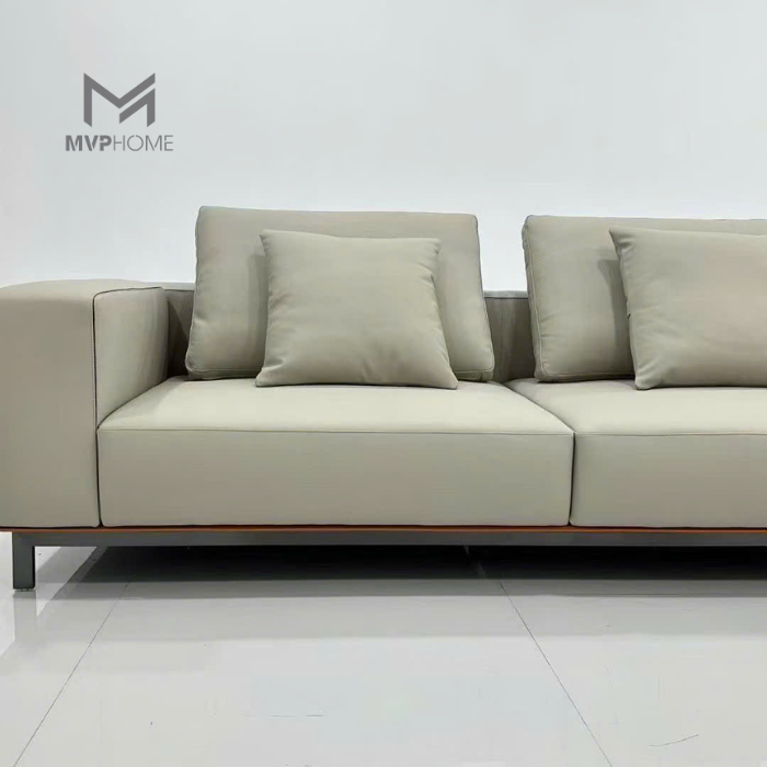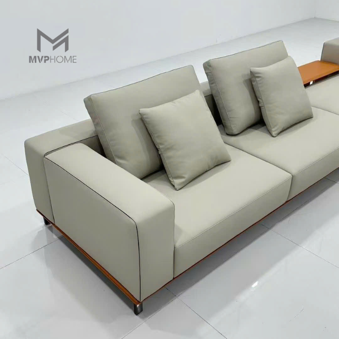 Toàn bộ phần nệm và gối tựa được bọc vải hoặc da cao cấp (tùy chọn), kết hợp với phần khung gỗ tự nhiên và chân kim loại sơn tĩnh điện mang lại độ bền vượt trội theo thời gian. Đệm ngồi êm ái, hỗ trợ tốt cho cơ thể, mang đến cảm giác thư giãn tuyệt đối mỗi khi bạn ngả lưng.
