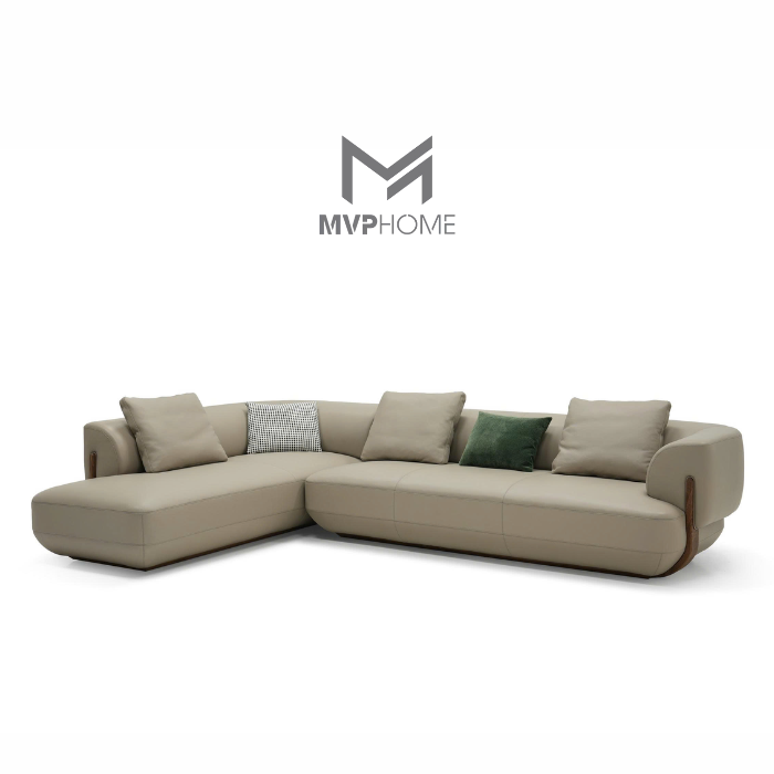 Mẫu sofa được thiết kế theo dáng góc chữ L rộng rãi, mang lại sự tiện lợi tối đa khi bài trí trong phòng khách. Hình dáng chữ L không chỉ giúp tiết kiệm diện tích, tối ưu không gian mà còn tạo cảm giác cân đối, hài hòa cho căn phòng. Đặc biệt, các đường nét bo tròn mềm mại ở phần tay vịn và tựa lưng mang lại cảm giác an toàn, tinh tế và hiện đại. Đây là kiểu thiết kế được nhiều gia đình trẻ yêu thích bởi sự đơn giản nhưng vẫn toát lên vẻ đẹp sang trọng, đẳng cấp.