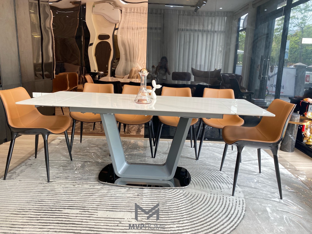 Nổi tiếng là bộ bàn ăn thông minh với chất liệu được sử dụng chắc chắn và bền bỉ. Mặt bàn được sử dụng là loại phiến đá ceramic trắng có chức năng có thể co giãn tùy thuộc vào số lượng người tham gia hoặc mong muốn của gia chủ mang lại một không gian ăn uống thoải mái.